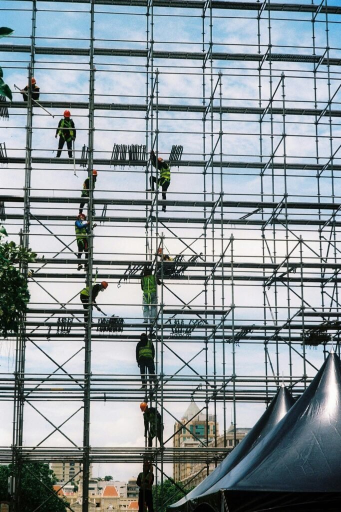 Our specialists carry out the assembly of scaffolding systems, working platforms, rolling towers, and safety meshes at both construction sites and operating facilities. We provide full service, including installation, on-site maintenance, and dismantling, working with all types of industrial and façade scaffolds. Upon request, we also deliver customized solutions such as temporary walkways, weather-protection tents, or covering scaffolds with thermal insulating film to ensure safe and efficient working conditions in any environment.